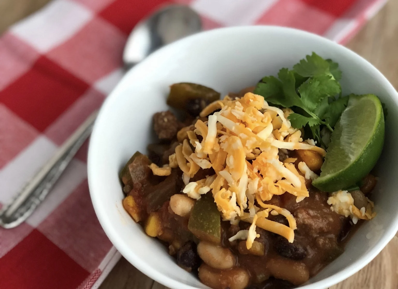 - Add in spices, beans, corn, tomatoes and water and stir well